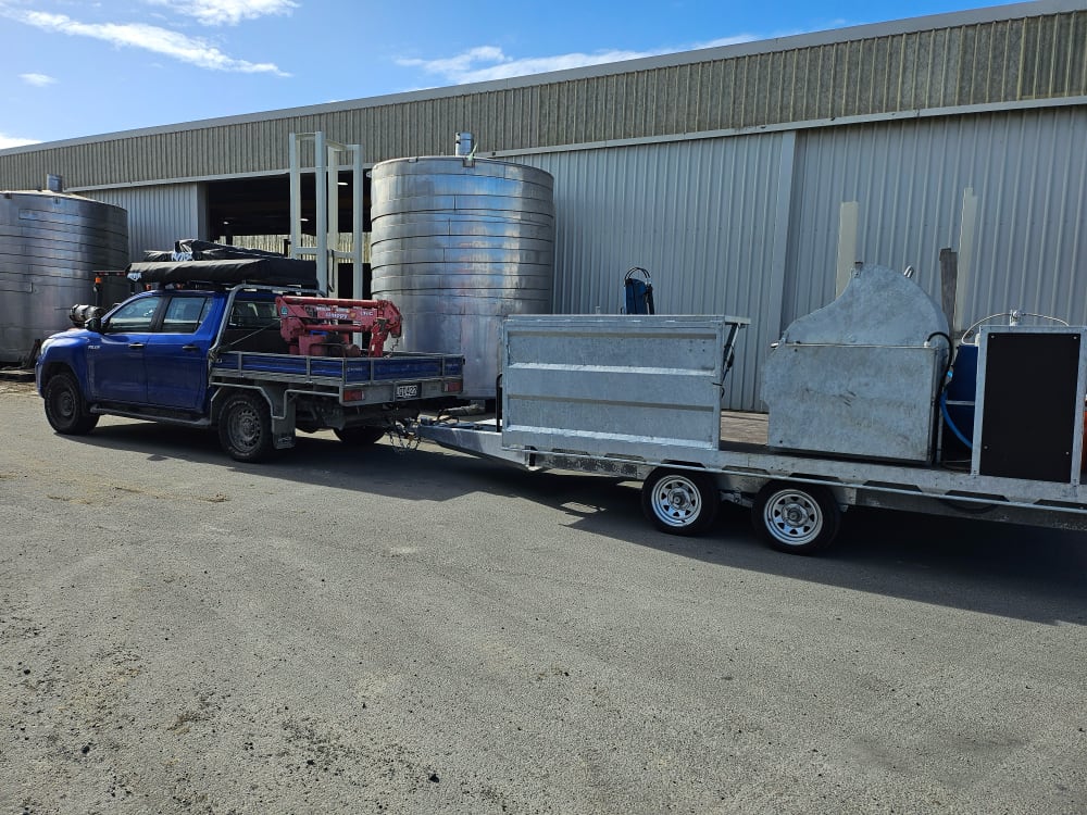 Mobile pig processing Rig featuring the Haas Hubert scalder dehairer powered by a Honda genset, all supplied by Tekam Engineering to Keiran at Central Slaughter, based in Taupo.